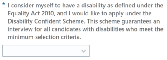 If you consider yourself to have a disability as defined under the Equality Act 2010, you can opt into our Disability Confident Scheme when applying for a role. Use the drop-down box on the application form to select ‘Yes’ to opt into the scheme, and providing you meet the essential criteria specified on the job advert, you’ll be progressed to the next stage of the recruitment process.